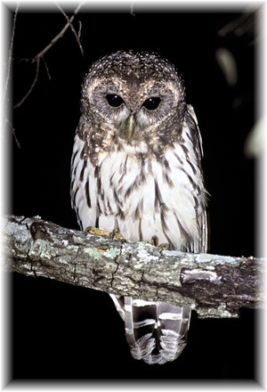 Mottled Owl (Strix virgata): habita una amplia variedad de bosques y plantaciones desde el nivel del mar hasta los 2,500 msnm. Anida en cavidades de árboles, a veces abandonados por otras aves. Es un depredador oportunista que caza desde perchas ubicadas en bordes y áreas semiabiertas presas como escarabajos, ranas, lagartijas, serpientes, aves y pequeños mamíferos.