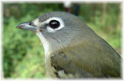 Blue-headed Vireo (Vireo solitarius): proveniente principalmente de los bosques de coníferas norteños del Este del continente americano, se alimenta de diversos insectos de talla grande y media y en invierno también de frutos. Forrajea en ramas y follaje de los árboles a altura media y comúnmente se une a parvadas de especies mixtas.