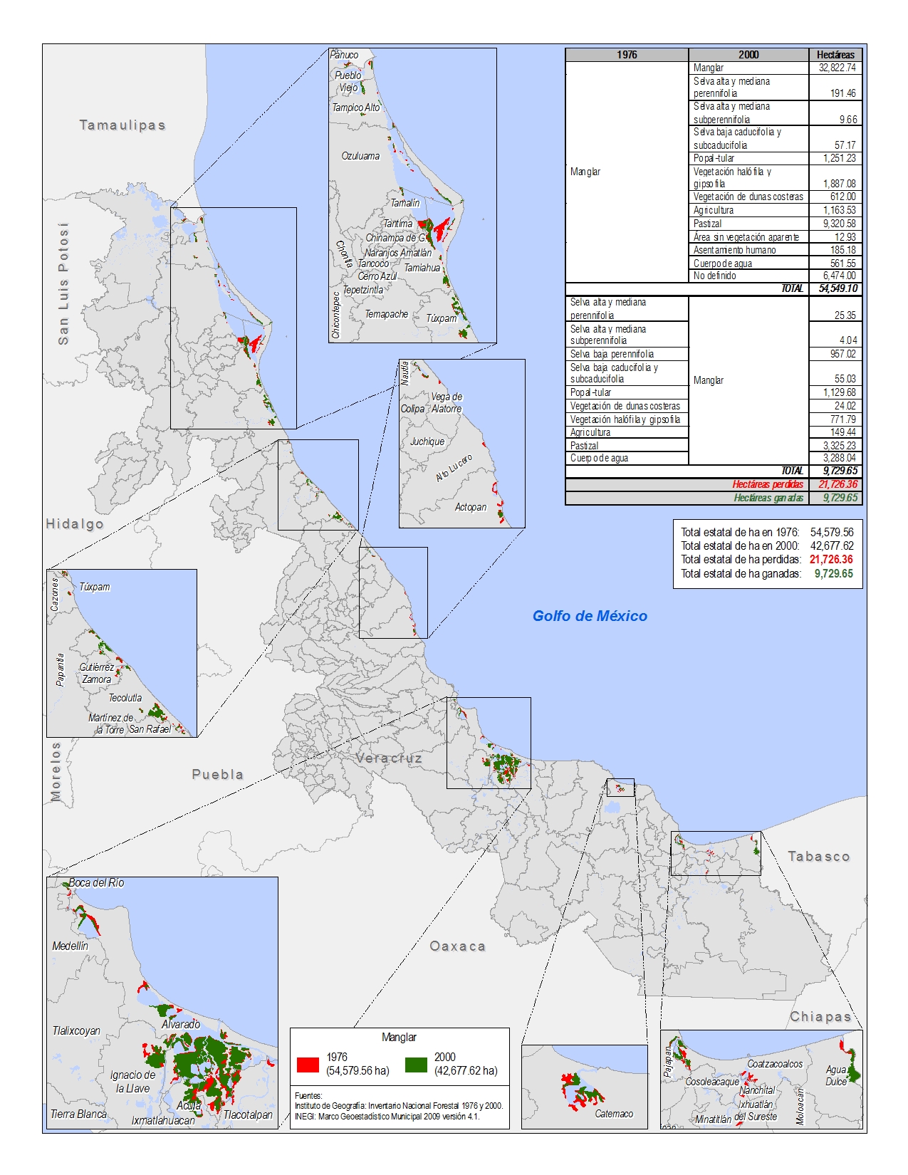 Para el periodo 1976 y 2000, datos de INEGI muestran una grave destrucción de manglares y otros humedales. En este lapso, se destruyeron 4,000 Ha, un promedio de 250 Ha anuales (mapa "Cambio de uso del suelo").